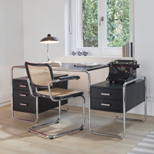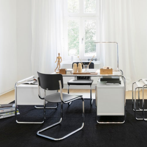 1920年代はバウハウスをはじめとしたドイツ表現主義と、オランダのデ・ステイルムーヴメントに刺激を受けた建築家やデザイナーたちが新しい家具の開発に取り組んだ時期でした。当時すでに曲木家具で有名だったトーネット社は、さらなる発展を求める中で自然とこうしたデザイナーたちと協力関係を結び、工業的な側面からその活動を支えるようになります。その最も顕著な成果がカンチレバーチェアです。木製の家具が当たり前だった時代にあって管状の鋼材を素材とし、4本の脚を必要としないチェアは椅子という家具に起きた革命でした。
