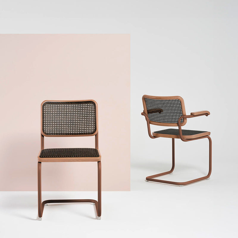 「Edition Herkner」のS32Vは、クラシックなカンチレバーチェアの現代的アレンジです。デザイナーSebastian Herknerが手掛け、座面には深みのあるダークメランジェカラーのケーン(籐編み)を用いた仕様です。フレームと木部には多彩なカラー展開が採用され、濃淡や色合いの絶妙なニュアンスを楽しめる仕上げとなっています。フレームは高級感のあるマット粉体塗装仕上げのスチールパイプで仕上げられており、背もたれと座面フレームはオーク材のステイン塗装仕上げとなっております。伝統と革新を兼ね備えたデザインで、現代のインテリアに自然なアクセントをもたらし、長く愛用できる逸品です。