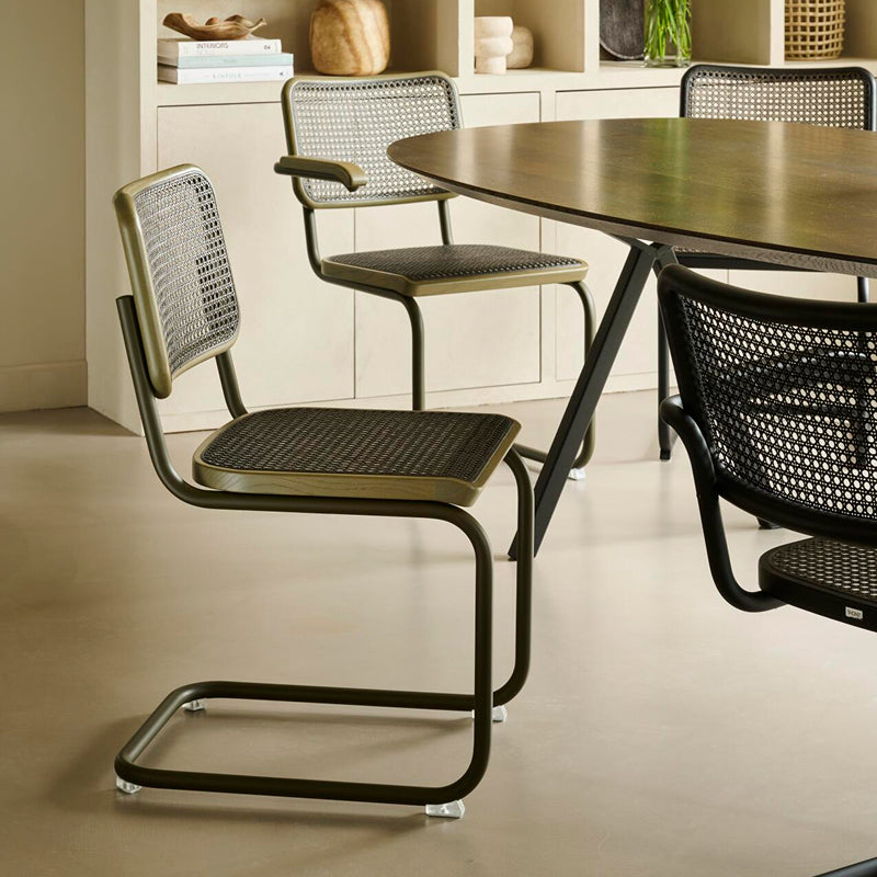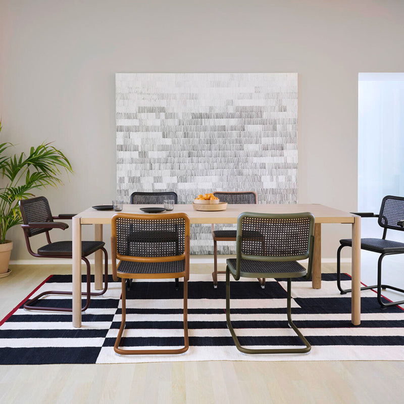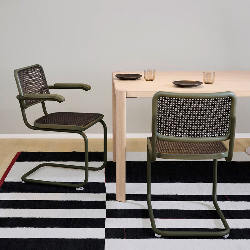 「Edition Herkner」のS32Vは、クラシックなカンチレバーチェアの現代的アレンジです。デザイナーSebastian Herknerが手掛け、座面には深みのあるダークメランジェカラーのケーン(籐編み)を用いた仕様です。フレームと木部には多彩なカラー展開が採用され、濃淡や色合いの絶妙なニュアンスを楽しめる仕上げとなっています。フレームは高級感のあるマット粉体塗装仕上げのスチールパイプで仕上げられており、背もたれと座面フレームはオーク材のステイン塗装仕上げとなっております。伝統と革新を兼ね備えたデザインで、現代のインテリアに自然なアクセントをもたらし、長く愛用できる逸品です。