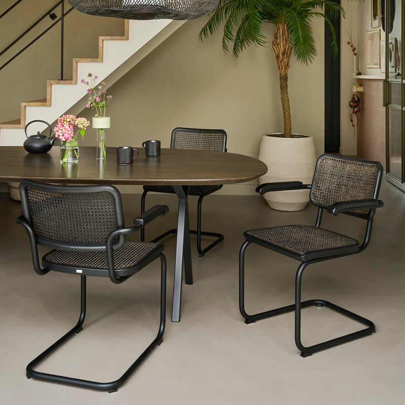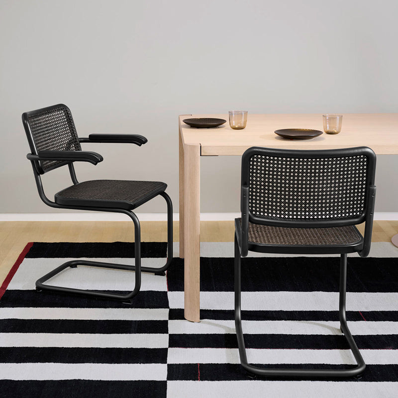 「Edition Herkner」のS64Vは、クラシックなカンチレバーチェアの現代的アレンジです。デザイナーSebastian Herknerが手掛け、座面には深みのあるダークメランジェカラーのケーン(籐編み)を用いた仕様です。フレームと木部には多彩なカラー展開が採用され、濃淡や色合いの絶妙なニュアンスを楽しめる仕上げとなっています。フレームは高級感のあるマット粉体塗装仕上げのスチールパイプで仕上げられており、背もたれと座面フレームはオーク材のステイン塗装仕上げとなっております。伝統と革新を兼ね備えたデザインで、現代のインテリアに自然なアクセントをもたらし、長く愛用できる逸品です。