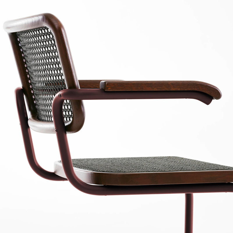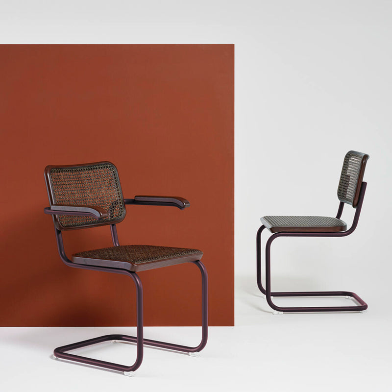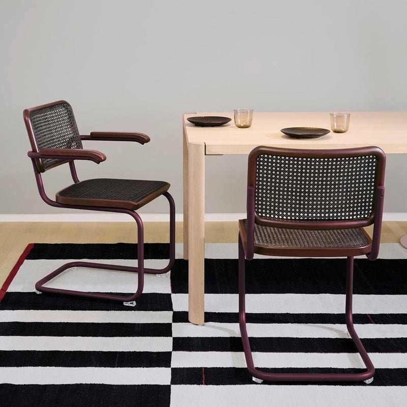 「Edition Herkner」のS64Vは、クラシックなカンチレバーチェアの現代的アレンジです。デザイナーSebastian Herknerが手掛け、座面には深みのあるダークメランジェカラーのケーン(籐編み)を用いた仕様です。フレームと木部には多彩なカラー展開が採用され、濃淡や色合いの絶妙なニュアンスを楽しめる仕上げとなっています。フレームは高級感のあるマット粉体塗装仕上げのスチールパイプで仕上げられており、背もたれと座面フレームはオーク材のステイン塗装仕上げとなっております。伝統と革新を兼ね備えたデザインで、現代のインテリアに自然なアクセントをもたらし、長く愛用できる逸品です。