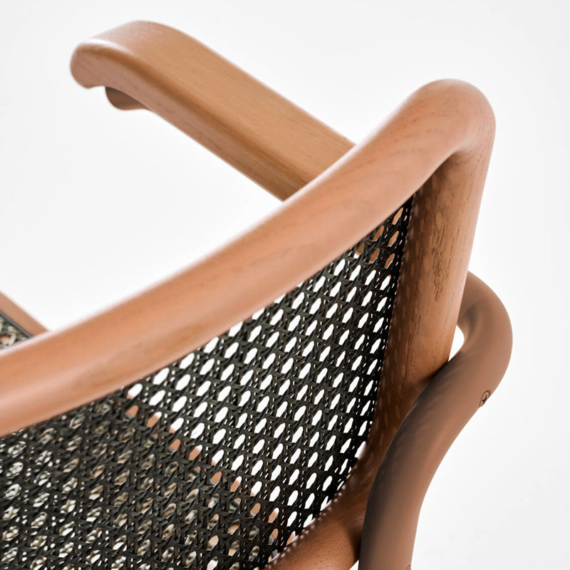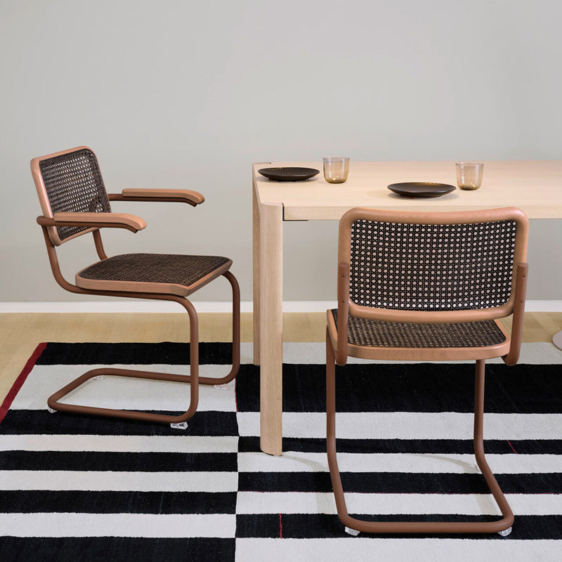 「Edition Herkner」のS64Vは、クラシックなカンチレバーチェアの現代的アレンジです。デザイナーSebastian Herknerが手掛け、座面には深みのあるダークメランジェカラーのケーン(籐編み)を用いた仕様です。フレームと木部には多彩なカラー展開が採用され、濃淡や色合いの絶妙なニュアンスを楽しめる仕上げとなっています。フレームは高級感のあるマット粉体塗装仕上げのスチールパイプで仕上げられており、背もたれと座面フレームはオーク材のステイン塗装仕上げとなっております。伝統と革新を兼ね備えたデザインで、現代のインテリアに自然なアクセントをもたらし、長く愛用できる逸品です。