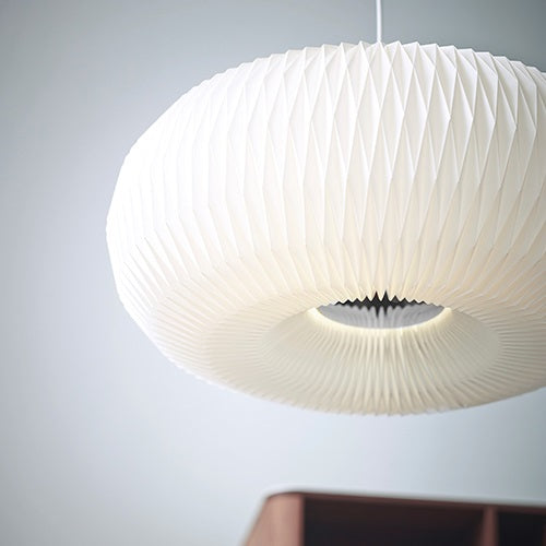 伝統の折りと手仕事に新しい解釈を加えたモデル「195」は、真ん中に穴が空いた形状から《ドーナツ》と呼ばれます。ブランドでも最も細かな折りのプリーツが特徴で、柔和なフォルムと繊細な印象が同居するデザインです。電球2個使いのため、明るさをお求めの方にピッタリのペンダントです。