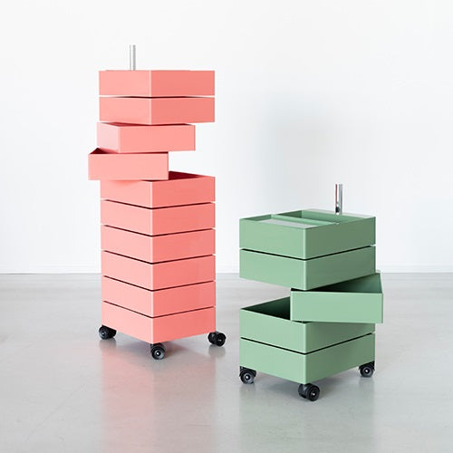 42×32×9.5cmセンチの収納トレーが、アルミニウム素材の支柱に縦に重なった可動式の収納コンテナです。各トレーが支柱を中心に360度、回転することにより開閉しますが、支点に仕掛けられたストッパーによってトレーは、中央で止まるように出来ています。トレーが多いほどに姿が雑然としがちですが、グルチッチの優れたデザインによって、その問題を見事に解消しているプロダクトです。トレーの素材には汚れにくいABS樹脂を採用し、書斎はもちろん子供部屋やキッチンでも活躍するインテリア収納です。