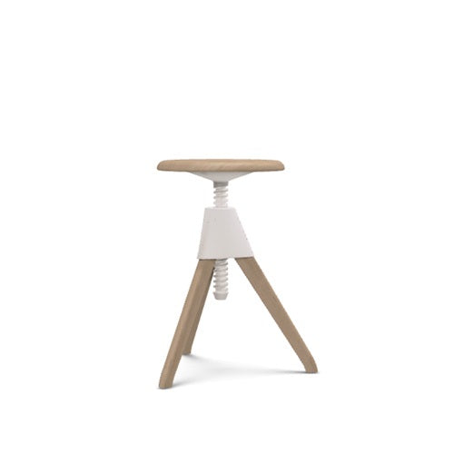 ネコとネズミのコミカルな物語を思わせる、愛嬌たっぷりのたたずまいのスツール。座面はネジのように回転させることで、16cmもの高さ調節が可能です。古典的な作業用スツールの構造を持ち、機構部に使われた色鮮やかな樹脂と、木の質感との対比が斬新な印象を与えます。ワークシーンのみならず、キッズ用のチェアやキッチンスツールとしても人気が高く、幅広い使い方が可能です。ナチュラル / グレーのコンビネーションは日本限定色。