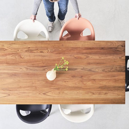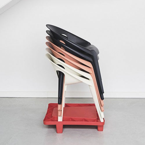 素材にはマジスの家具製造と地元の自動車産業から出る余剰プラスチックを使用。製造時のエネルギー消費も少ない上、最大24脚の椅子を積み重ねられることから輸送時の環境負荷も抑えられ、梱包材も最小限で済むよう設計されています。