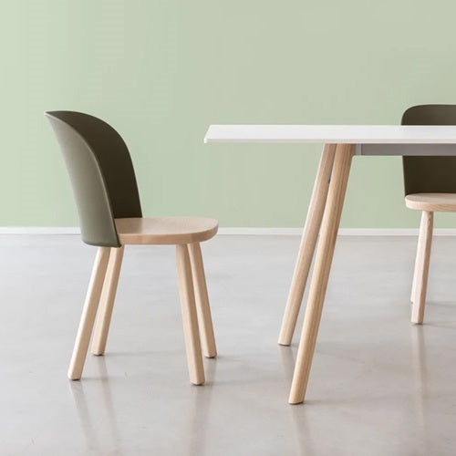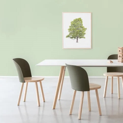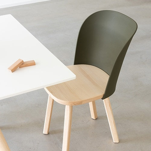アッシュ無垢材(FSC認証)のフレームに、廃食用油を100%原料とするバイオベースポリプロピレン(※)の背もたれを組み合わせていることから、リサイクルが可能で、循環型の社会に対応しています。