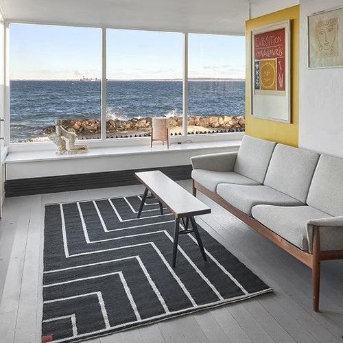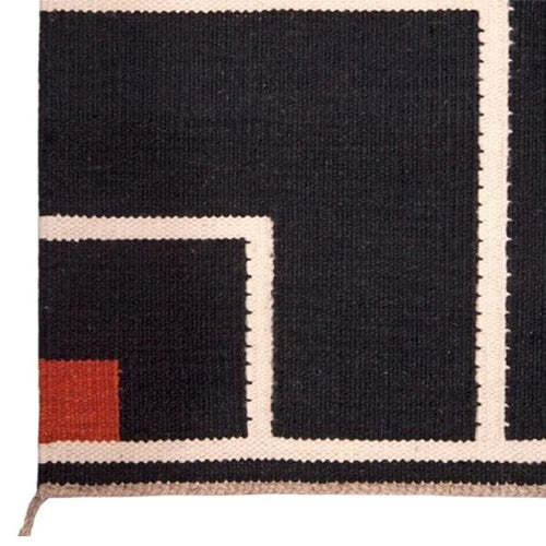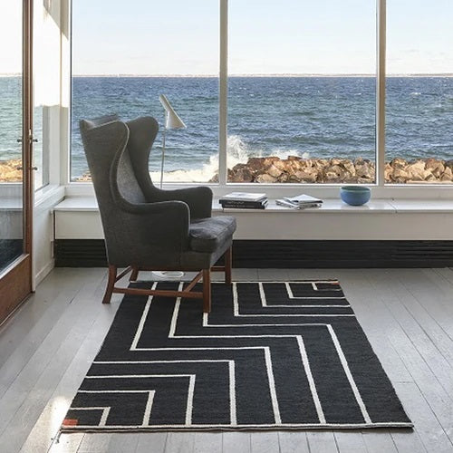 VK-1ラグは、1980年代にデンマークを代表する名工、ヴィブケ・クリント(1927-2019)が手がけた手織りラグの一つ。縦糸と横糸を組み合わせる平織りの技術が採用されており、パイルがなくフラットで文様の美しさが際立ちます。2つのコーナーにある正方形に向かってストライプが連続する幾何学的なデザインは、彼女のデザインスタイルを象徴しており、元はアルネ・ヤコブセンが手がけたデンマーク国立銀行のためデザインされました。