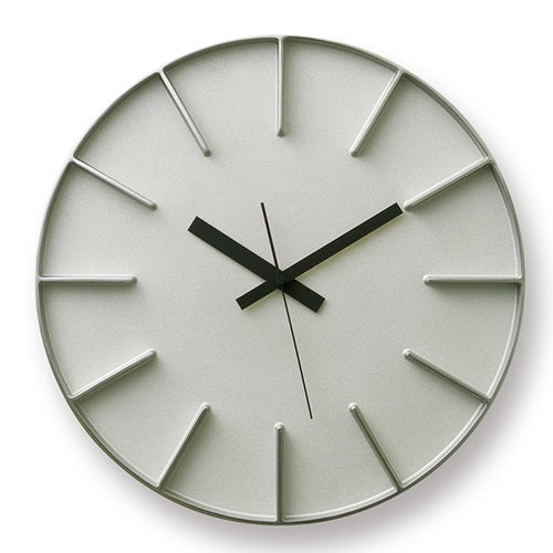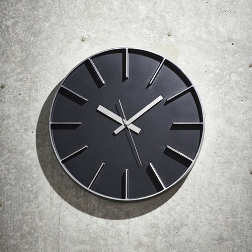 アルミ一体成型の精緻な品質とシンプルで力強いフォルムが特徴のedge clock。富山県高岡市の伝統的な砂型鋳造によるアルミボディをサンドブラスト処理することで、インダストリアルなフォルムの表面に工芸的な質感を醸し出しており、丁寧に磨き上げられたインデックスとのコントラストはシャープで趣深い印象を与えます。