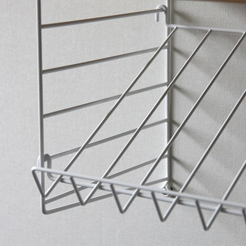 3段シェルフは、キッチン周りの細々した調味料やよく使う小物を置いて使い勝手のよいキッチンに。ストリングは水平方向の連結も自由自在で、基本のシステムを組んでしまえば、棚板を足したり、組み替えたり、お好みの収納が出来上がります。