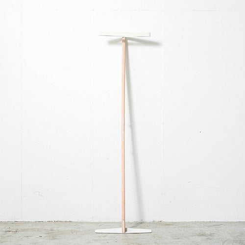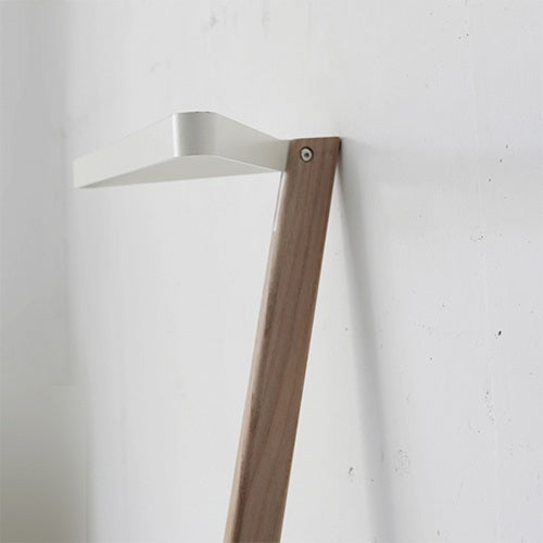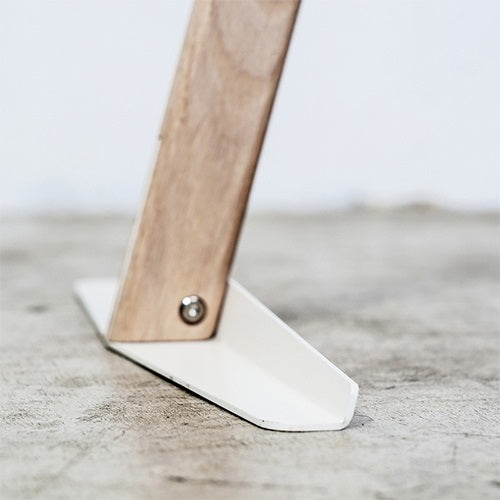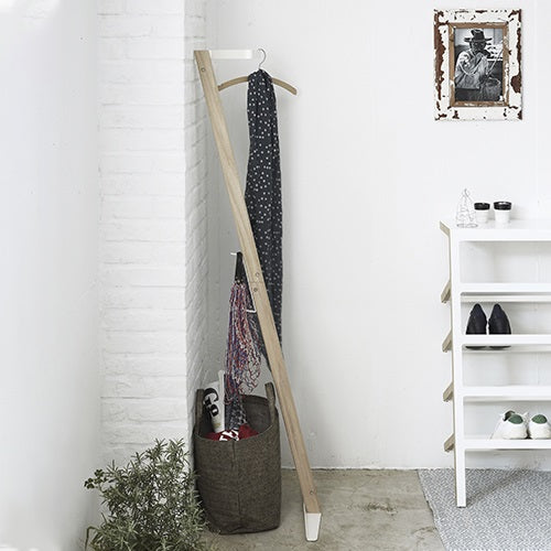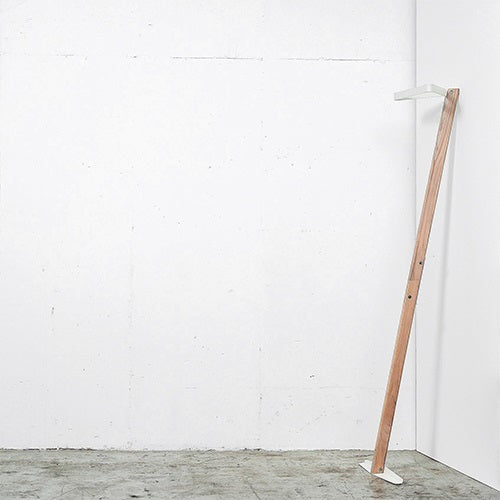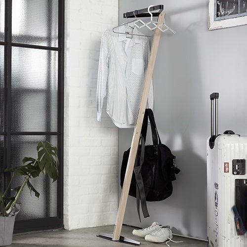 厚みのあるスチールの三角形とオークの無垢材を贅沢に使用し、衣類をかけるための要素を必要最低限の構成要素で完成させています。