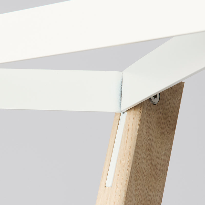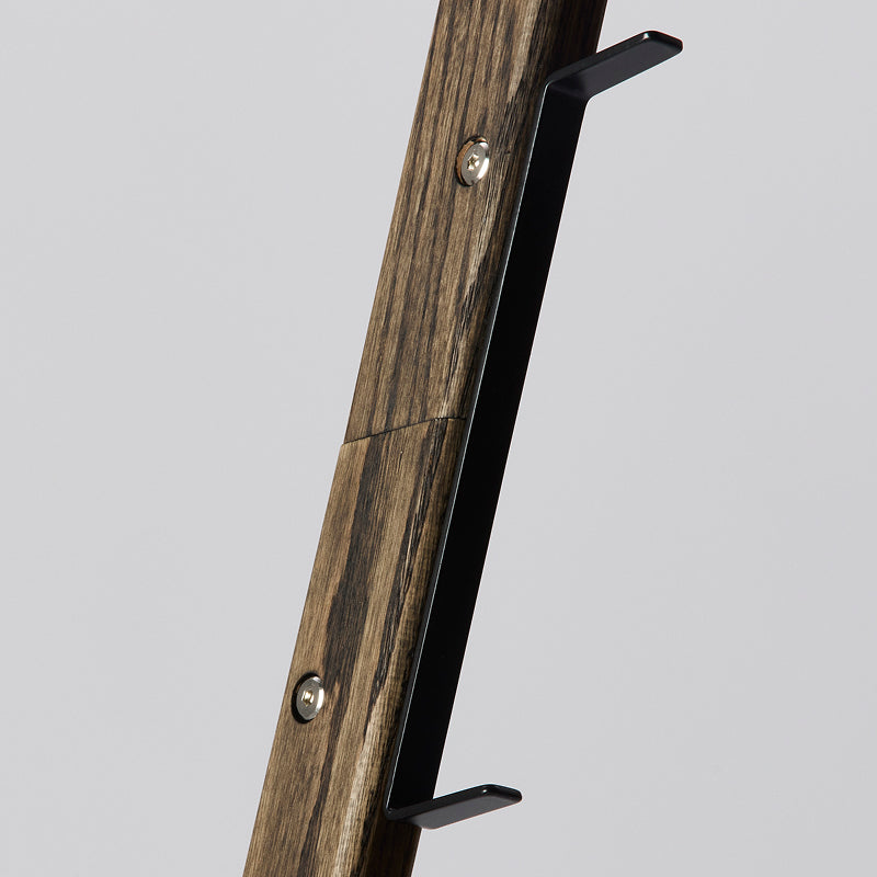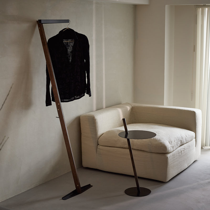 DELTA(デルタ)は、オークの無垢材を贅沢に使用し、スチールを三角形で成形することでデザイン性の高いハンガーを実現。一見、ハンガーとは思えない機能を最低限の構成要素で叶え、廊下や壁面の場所を選ばず設置するだけで端正なデザインハンガーが完成します。