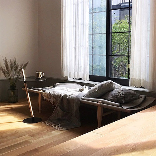 一般的なサイドテーブルの高さは、ソファーや椅子に腰掛けたときに置いてある飲み物やリモコンなどを少し手を伸ばして取るような高さに設計されていますが、TUBE & RODは構造とデザインの両面からやや天板の位置を高くしています。通常のサイドテーブルよりもコンパクトなサイズとなっているので、デスクまわりやソファー周辺だけでなく、リビングスペースや玄関先での小物置き台としても活用することができます。