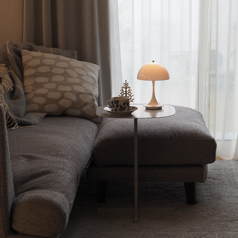 SOLID STEEL TABLE(ソリッド スチール テーブル)は、十字にクロスした重厚感のあるベースから前後の角のアール率が微妙に異なる緩急のついた天板が特徴的なサイドテーブル。