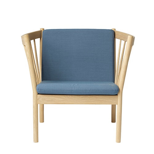FDBモブラーでも販売当初から人気があったチェア「J146」。スポークが採用されたフレームのスッキリとしたフォルムが印象的です。外角に緩やかに湾曲したアームは、見た目の美しさと座り心地を両立するデザインです。1970年代当時、デンマーク人にとって快適なリビングチェアのイメージは布張りの大振りなもので、居間のスペースを占有していました。エリック・オーレ・ヨーエンセンは、シンプルさと快適性を両立した今日でいうラウンジチェアのような設計のJ146チェアを通して、この課題を解決したデザイナーの一人です。シリーズには1人掛けのJ146、J2人掛けのJ148、3人掛けのJ149があります。ニュージーランド産ウールのファブリックは北欧モダンを思わせるトーンの3色で、幅広いインテリアにマッチします。