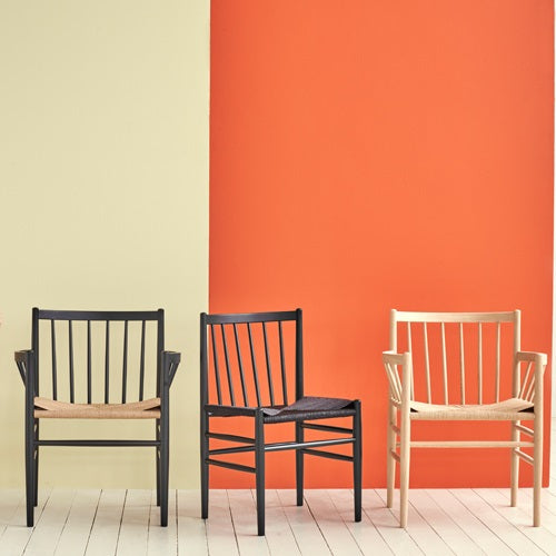 デザイナーのヨーエン・ベックマークは、社会繁栄に伴い、「民衆の為の家具造り」という同社の哲学にこだわることなく、軽くて頑丈な扱い易い家具、輸送を考慮した組立てや分解が簡単な製品を世に送り出しました。FDBモブラー4代目最後の企画デザイン担当責任者として、他の前任者と比べ一番長い9年間つとめています。J80がこれまでのチェアと大きく違う点は木部が非常に細く、モーエンセンが採用して以来、ヴォルタとヨハンソンの採用することのなかったペーパーコードを座面に用いたことです。また蒸気でひねりを加えた背はJ80、J81の為に開発されました。 それらを採用することで従来より大きさの割に軽く、柔らかい座り心地と快適な背を実現しました。