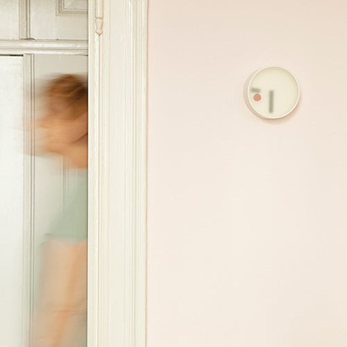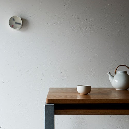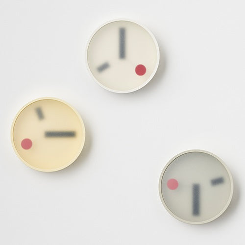 ぼんやりと見える針の動きが半透明のガラス越しに曖昧な時の気配を柔らかく伝えてくれます。色は空間に馴染み、より気配として佇むよう壁の素材に合わせた3色で、秒針の赤い点がゆっくりと回る様はオブジェのようです。薄く繊細ながら強靭なアルミ枠体は鋳造の技術が活かされ、その製造を高田製作所がおこなっています。