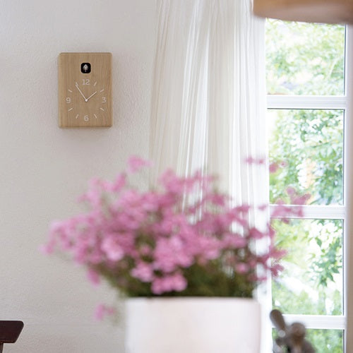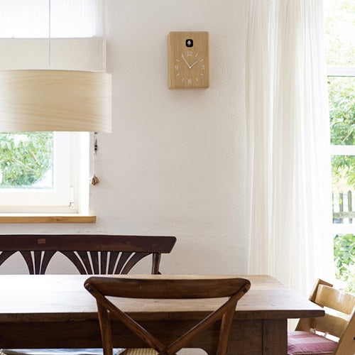 小川のせせらぎの音と共に、愛らしいカッコーの鳴き声で時を告げる時計です。シンプルな巣箱を模した形状は、壁掛けはもちろん、置時計としても使えます。ブラックは無垢のタモ材の木目を残した高級感のあるバリエーション。ライトセンサー機能付きで、就寝時など消灯時には小鳥もお休みして鳴きませんので、静かにお休み頂けます。