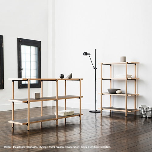 イトウケンジが手がける、上品で控えめなシェルフ「LOG-ログ-」。木製フレーム(直径30mm)にはブナ、棚板の表面材にはリノリウムをそれぞれ使用し、双方の素材が互い存在を邪魔をせず、シンプルかつ上品さを演出しています。棚板の芯材には、軽量ながら強度があるハニカム構造を採用。細部にまでこだわった美しいディティールは、日本有数の家具の産地である北海道・旭川近郊の職人により、丁寧に作られています。床面の傾きに対応するアジャスターが付いており、設置時のガタつきを緩和してくれます。