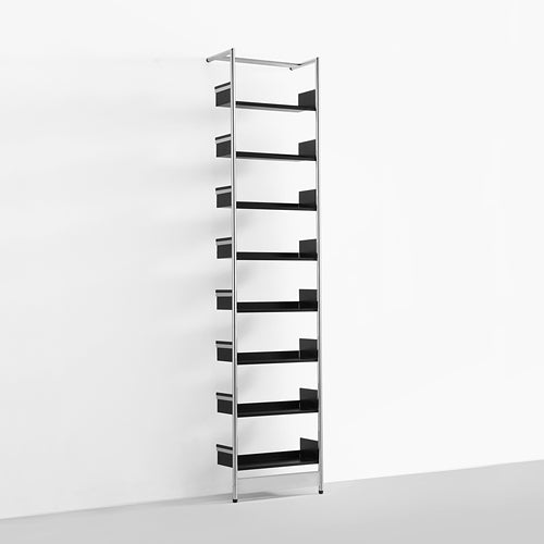 壁に立て掛けて使用するこの「CD POOL」は、8つの棚に約300枚ものCDを収納することができる、シンプルな中にデザイン性と実用性の高さが際立つラックです。