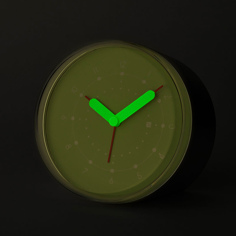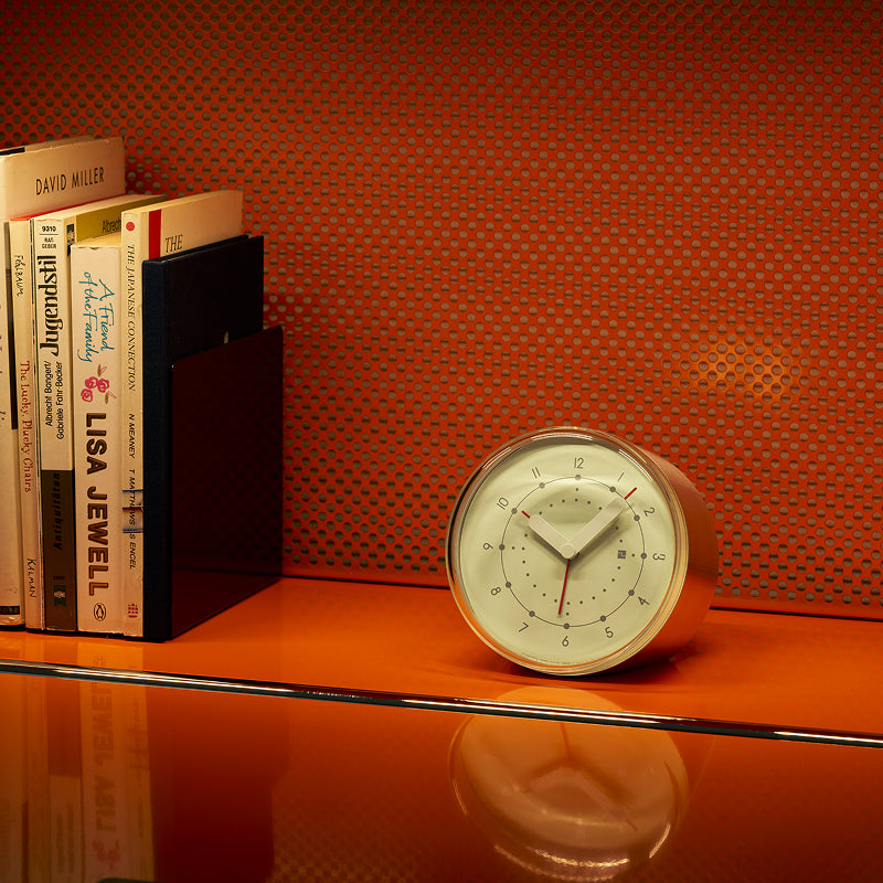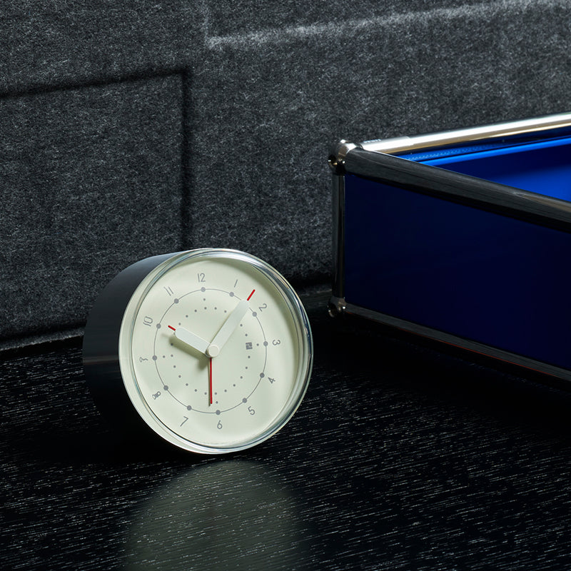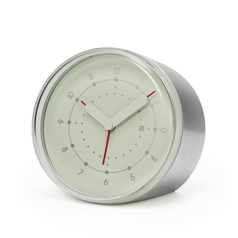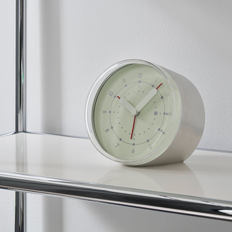 アルミニウムの円筒をカットしたシンプルなフォルムの目覚まし時計。